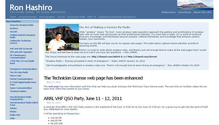 Ten years later, I am writing about Ron’s site again because it is rare that a personal website has much longevity, and 10 years-plus certainly qualifies as longevity in the lightning-paced world of the Internet. Beyond that, Ron’s site has grown exponentially during the decade and offers lots of information regarding ham radio in our 50th state.