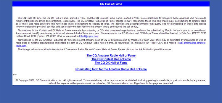 You can view the complete list of Hall of Fame inductees here. Peruse the list and see which makers and shakers of ham radio have made it into the Hall. Also, consider who is missing and deserving, because nominations are now open for the 2010 class of inductees.